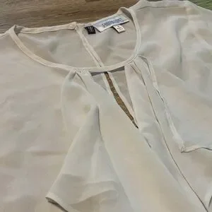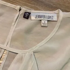 Sheer blouse with soft cascading front ruffles. Roll-tab sleeves for a versatile look. Lightweight and flowy fabric. Elegant, easy layering piece.