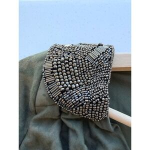 utility chic, beaded dress, olive green, INC dress, ruched sheath, cowl neck, evening wear, cocktail dress, size medium, glam style, statement shoulders, office siren