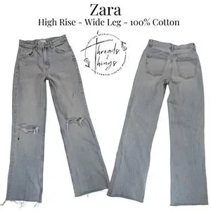 Discover your new favorite denim with these effortlessly cool ZARA jeans. Crafted for a flattering high rise and a trendy wide leg silhouette, they feature authentic distressing and a light wash for a perfectly lived-in look. The raw, frayed hem adds a touch of modern edge, making them ideal for pairing with a graphic tee and sneakers for a casual day out or dressing up with a blouse and heels for a night on the town.
