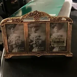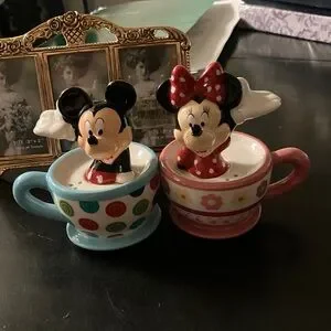 Pair of Disney ceramic salt and pepper shakers featuring Mickey and Minnie in teacups. Bright painted details and playful facial expressions. Ideal for collectors or themed displays. And picture frame.