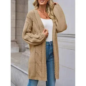 Features: Soft and breathable open front cardigan with a relaxed fit, perfect for layering. Beautiful cable knit pattern and long lantern sleeves add a touch of elegance. Wear it open for casual outings or dress it up with a dress and boots.