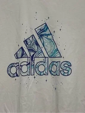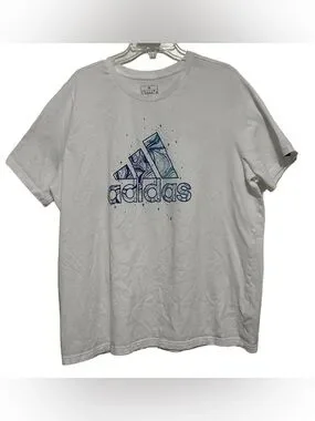 Lightweight short sleeve tee with adidas graphic on front. White base with blue patterned logo detail. P2P 25 inches Length 29.5 inches. 100% Cotton