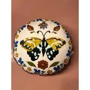 Invite a whimsical pop of color into your living room or reading nook with this embroidered pillow.