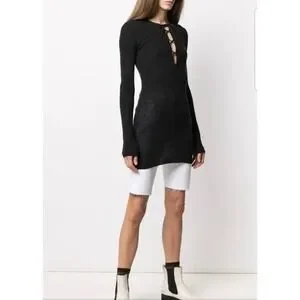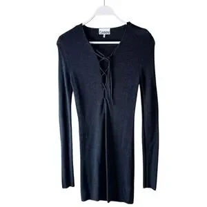 GANNI Black Ribbed Merino Wool Lace Up V Neck Tunic Top Dress Women's Size M