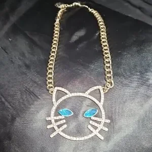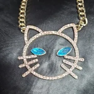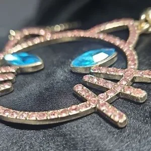 Betsey Johnson Pink Cat Face Necklace with Blue Crystal Eyes
