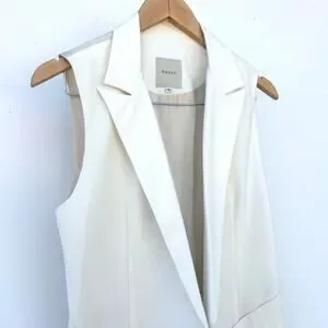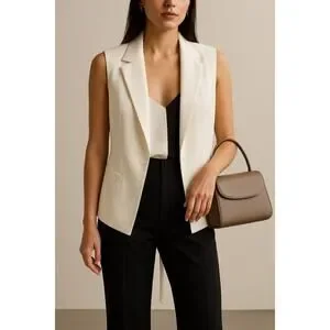 Elegant Mason ivory vest in a modern sleeveless-blazer design—perfect for workwear, minimalist outfits, or chic layered looks. Crafted in a premium blend with a silky interior and structured finish, this piece nods to quiet luxury tailoring and the refined menswear trend. Style as a top with trousers or pair with denim for an elevated off-duty look. A versatile neutral staple that feels timeless, polished, and contemporary.