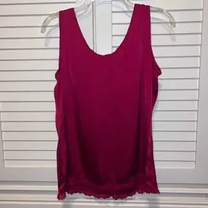 Kathleen Kirkwood 97% silk camisole in a vibrant berry pink hue. This elegant top is crafted from a luxurious silk-spandex blend, offering a slight stretch for a flattering fit. It features delicate lace trim along the scoop neckline and hem, with vertical princess seaming on the front to create a structured, corset-inspired silhouette. Perfect for layering or wearing as a standalone piece for a sophisticated look.