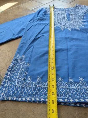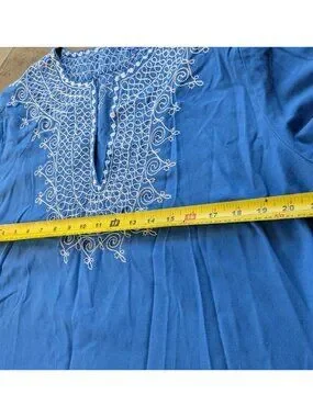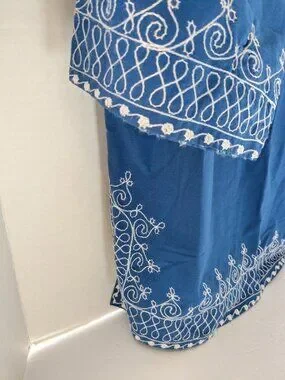 Beautiful traditional Moroccan embroidered tunic in blue with intricate white decorative stitching. This piece features the classic gandoura/kaftan-style split neckline, ornate embroidery on the front, sleeves, and hem, and a relaxed, easy-to-wear silhouette. Marked a Women’s Large.