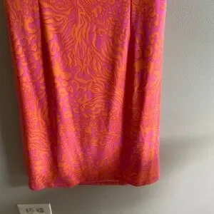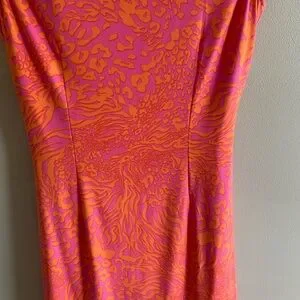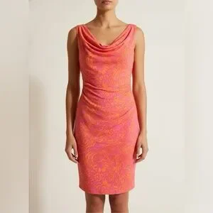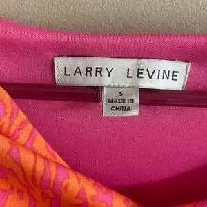 This stunning Larry Levine dress is perfect for any occasion. The pink and orange color combination is eye-catching and the ruched Chittah pattern adds a touch of elegance. The boat neck and sleeveless design make it ideal for a formal event or a cocktail party.