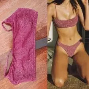 Shimmery pink two-piece bikini with a supportive scoop-top and low-rise bottoms. Designed for a comfortable, flattering fit and everyday beachwear. Lightweight, stretchy fabric with subtle sparkle for a stylish look. Perfect for pool days and sunny getaways.