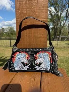 Ed Hardy shoulder bag with bold twin unicorn embroidery. Black leather-look body with stud accents. Features red flame and blue mane details. Detachable charm and secure top closure. Eye-catching rocker aesthetic.