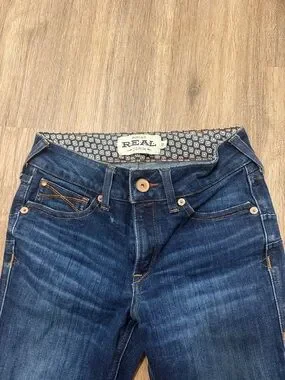 Flared silhouette with wide leg. Dark blue stretch denim. Raw frayed hem detail. Subtle back pocket stitching. Used and some wear and tear but pretty good condition! Size 27L(long)