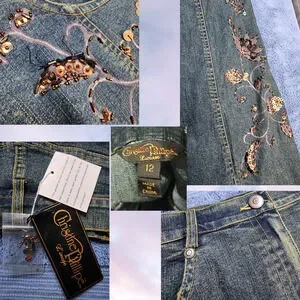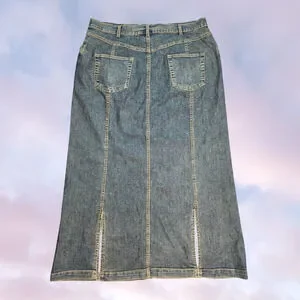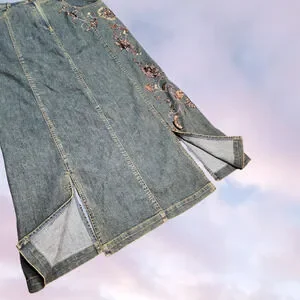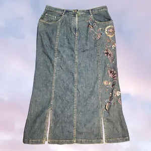 NWT New With Tags Vtg Vintage Y2k Christine Phillipe It Girl Preppy Whimsy Fairy Festival Party Night Out Beaded Floral Denim Jean Long Maxi Skirt. This beautiful medium wash denim skirt has intentional slits in the front and back near the bottom. Has pockets in front and the back, and belt loops. There is a cute beaded copper brown flower vine design down one of the front sides. This skirt would look really great paired with stiletto kitten heel boots or platform sandals.