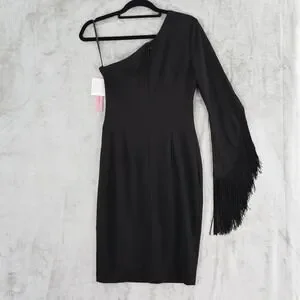 AQUA One Shoulder Fringed Sleeve Sheath Dress Womens 6 Black Formal Holiday NWT