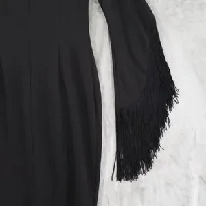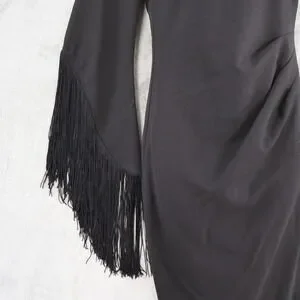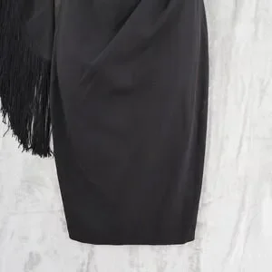 A striking black sheath dress with a one-shoulder design and dramatic fringed sleeve. This elegant piece features a flattering ruched detail at the waist, creating a sophisticated silhouette. Perfect for cocktail parties, formal events, or a night out.