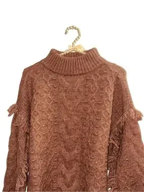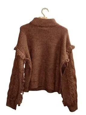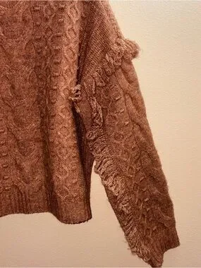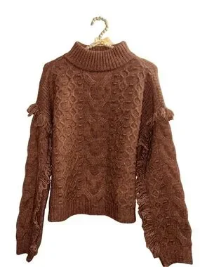 Soft brown cable-knit turtleneck sweater with textured stitch work. Relaxed fit for effortless layering. Fringe accents along the sleeves add subtle, stylish interest. Comfortable and warm for everyday wear.
