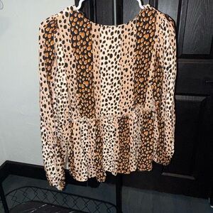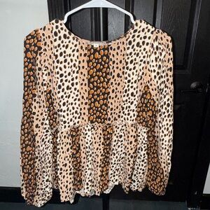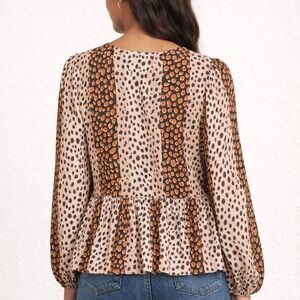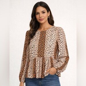 Light beige peplum blouse with mixed orange and black spot print. Round neckline and long sleeves. Elasticized cuffs and flowing hem. Casual yet polished for everyday wear.