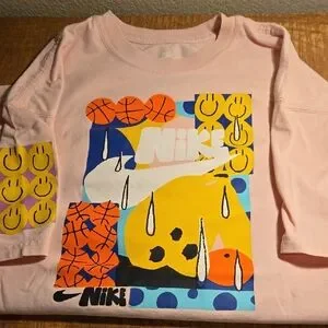 Nike pink t-shirt with vibrant graphic design. Features bold colors and unique patterns. Artwork by David Bruce.
