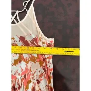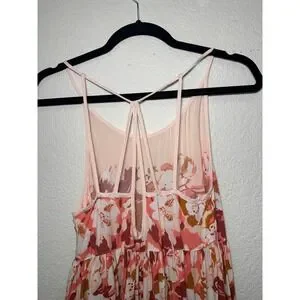 Capture ethereal charm with this Free People slip dress, designed to move with you. Delicate spaghetti straps crisscross at the back, leading to a flowy silhouette that gently gathers at the empire waist, creating a flattering, airy feel. The bodice and skirt are adorned with a captivating floral print in shades of cream, blush pink, and rust, transitioning into a solid cream hem for a touch of understated elegance.