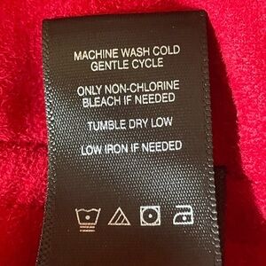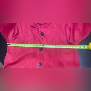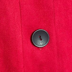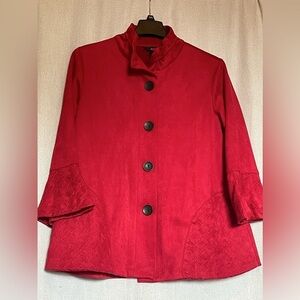 Beautiful red color. Big black buttons. Quilt-look pattern and wrists and bottom front. Perfect accent piece or to layer between seasons.