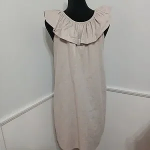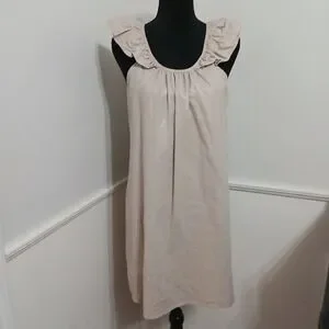 Linen-blend shift dress features a subtle metallic shimmer throughout the beige fabric, offering a sophisticated yet relaxed aesthetic. Designed with a feminine ruffled scoop neckline and sleeveless silhouette, this piece provides a breezy, loose fit perfect for warm-weather occasions.