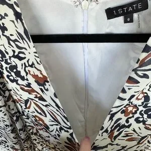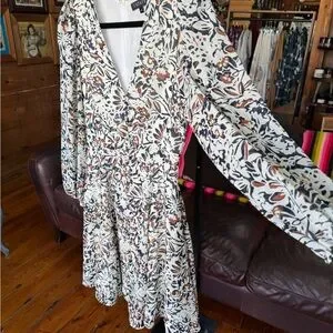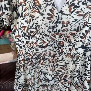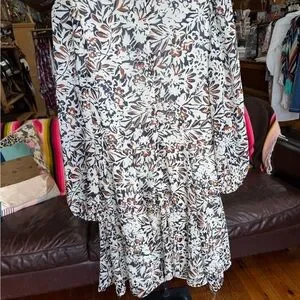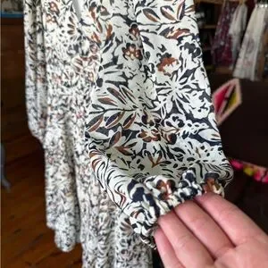 Elegant floral print dress with long sleeves. Features a mix of black, brown, and cream colors. Flowy with shape and fully lined. Very pretty dress, and you guessed it!…it has pockets!