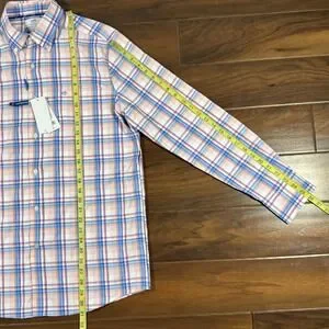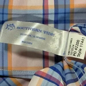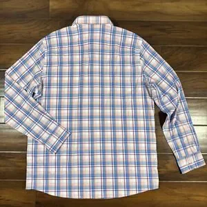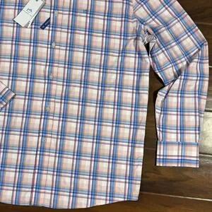 Southern Tide Men's Size Medium Pink and Blue Parfait Pink Gaspee Plaid Intercoastal Sport Shirt Long Sleeve, 91% Nylon 9% Spandex, Button Front, One Chest Pocket, Stretch, Wicking, UV Protection, Style # 11441