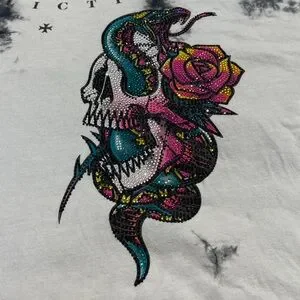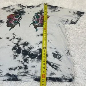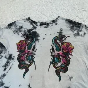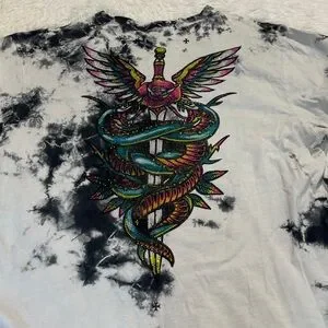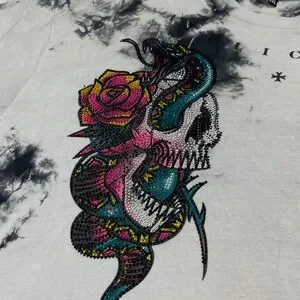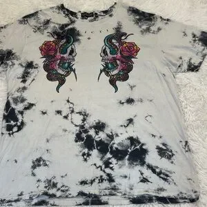 Bold tie-dye design with skull and snake graphic. Vibrant colors stand out. Perfect for casual wear. VERY GOOD PREOWNED CONDITION COTTON