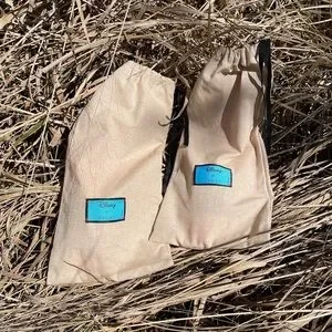 box. The dust bags are natural-colored and black ribbon closures are 100% organic cotton.