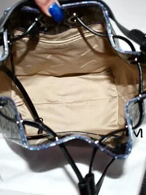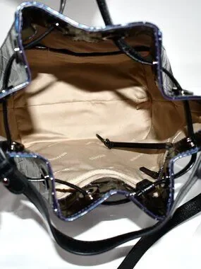 The smooth black leather trim brings in a grounding element and the gunmetal hardware complements the colors of the collection