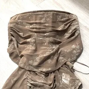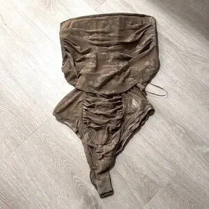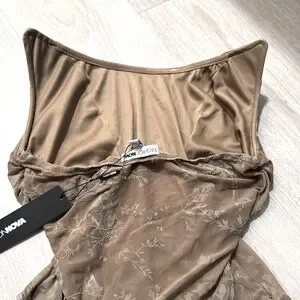 Taupe sleeveless floral print Vintage bodysuit. Double lined with mesh ruched detail. Front boning detail. Snap button closure. Stretch. Size: L NEW