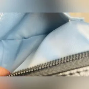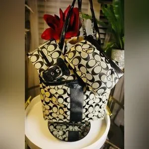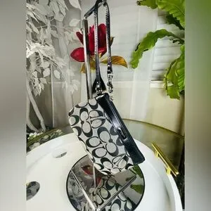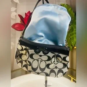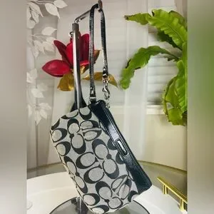 This Coach Corner Zip Wristlet in Black and Grey exhibits normal wear consistent with its use. It's a compact wristlet featuring the timeless Coach signature monogram pattern in black on a grey background, accented with black leather trim. Secured with a top zipper closure, it includes a metal Coach tag on the front for added detail. The wristlet is equipped with a convenient leather link strap, offering effortless carrying and a touch of elegance to any outfit.