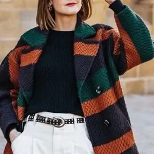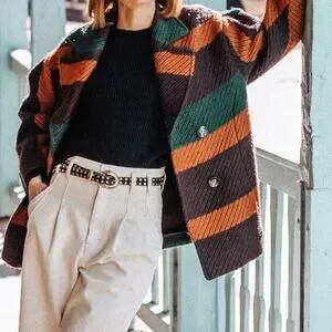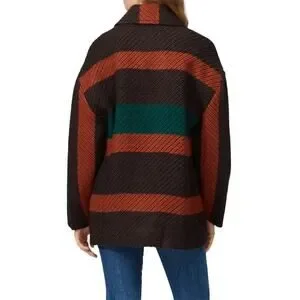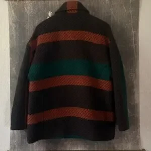 Brown and green striped woven polyester (63% Polyester, 14% Silk). Jacket. Long sleeves. Exposed center front button closure. Fully lined. Side pockets. 30" from shoulder to hemline. Imported.