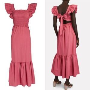 Sea New York Gladys Maxi Dress in Rose Pink. Size Large. Features lightweight weave fabric, square neckline, ruffle flutter sleeves, smocked elastic bodice with ties at back, flounce hem, covered elastic waistband. Unlined. Shell: 100% cotton. NWT / New with tags. MSRP $495.