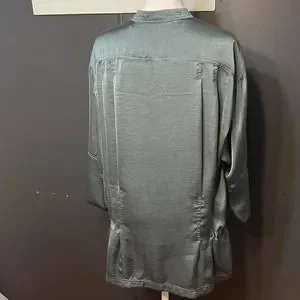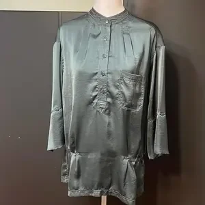 Elegant blouse, it is 27” long. No rips, stains, or holes. It has all the original buttons, including the extra button attached on the inside side tag. It’s a gray-ish green smooth silky color. It is 100% polyester, as shown on the tag inside the blouse. Comes from a smoke free and pet friendly home.