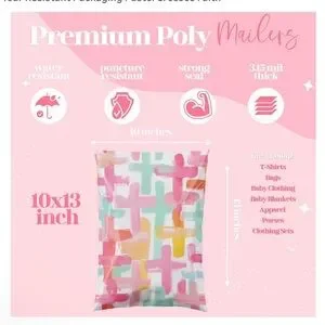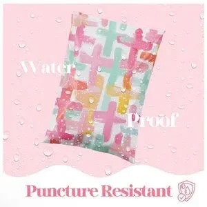 Vibrant poly mailers with a playful pastel brushstroke cross print. Lightweight, water-resistant exterior protects shipments while adding a cheerful look. Features white background with pink, mint green, and yellow accents for a fresh presentation.