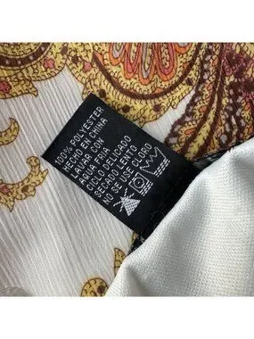Lightweight sleeveless blouse - tank top - cami - camisole - white with a yellow, gray, orange & brown retro paisley pattern. Decorative tie on the front. Sweetheart neckline. Adjustable straps. Inner white lining. Zipper closure on the side. Inner lining has a stretch. 100% Polyester.