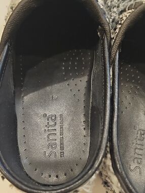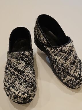 Slip-on SANITA Clogs with tweed upper. Padded leather insole for comfort. Black, White and Gray Tweed. Size 41EU. very nice used condition with minimal wear. The Original Danish Clogs.