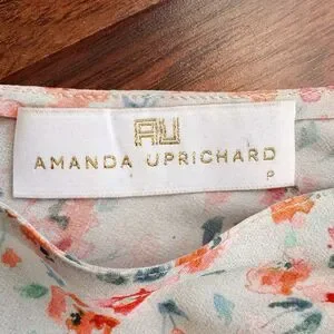 This is a beautiful Amanda Uprichard 100% Silk Sleeveless V-Neck Tank Top. Soft, pastel colored micro floral print. Size P= US size XS as per designers website size chart. Little ties at the tops of the shoulders that can be scrunched up and tied or left wider. Relaxed, loose fit. Flares out at waist for a comfy & flowy fit.