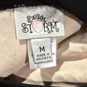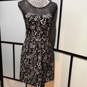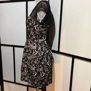 Elegant Sweet Storm midi dress. Black lace overlay with cream underlay. Sheer mesh neckline and cap sleeves. Fitted waist and slightly flared skirt. Perfect for evening occasions.
