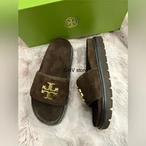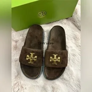 Stylish black slide sandals with iconic Tory Burch logo. Comfortable and chic for any occasion.
