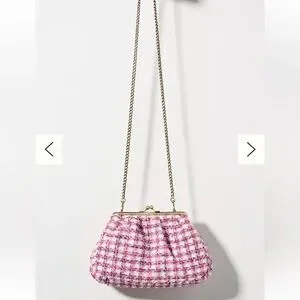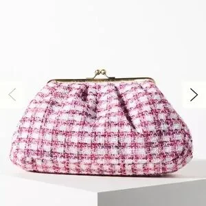 Anthropologie Audrey Plaid Clutch & Crossbody Purse Pink White Tweed Gold Chain