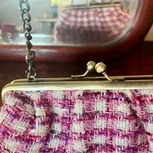Chic pink and white tweed bag with gold tone frame closure and removable chain strap. Can be worn as a clutch for evening or styled crossbody for events, weddings, holiday parties, brunch, or date night.