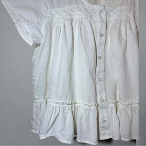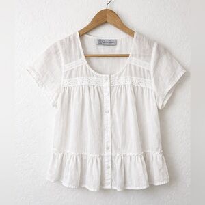 Super cute Jessica Simpson white peplum blouse with feminine lace yoke detail and button front. Lightweight and flowy with a flattering babydoll fit—perfect for spring/summer styling.