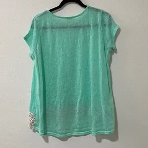 Mint green top with elegant crochet flower hem. Ideal for casual outings.