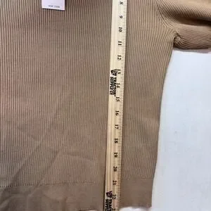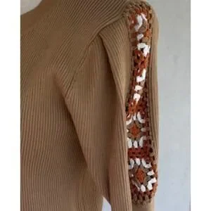 Keywords: Nanette Lepore, ribbed knit, crochet sleeve, camel top, women's sweater, artisanal detail, bohemian accent, casual chic, workwear staple, weekend style, statement sleeves, textured knit, fashion top