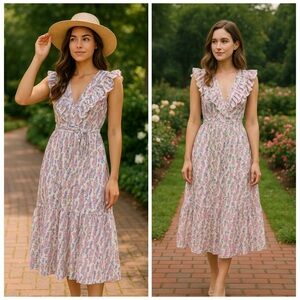 midi dress, v neck dress, ruffle sleeve dress, flowy silhouette, tiered midi, floral midi dress, romantic style, flattering fit, feminine aesthetic
