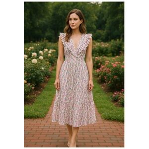 BY TIMO Floral Ruffle V Neck Midi Dress White Pink NWT Size XL