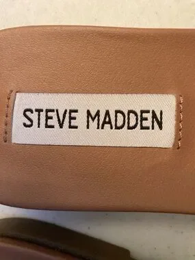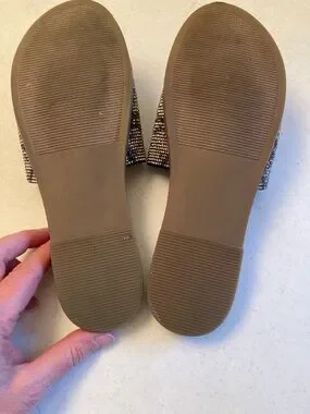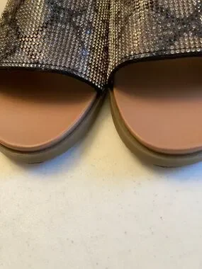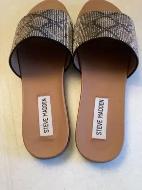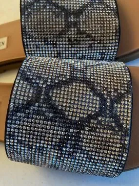 Steve Madden slip-on slides with a wide rhinestone snake-print strap. Cushioned tan footbed for easy wear. Sparkling black and silver stones add glam to outfits.