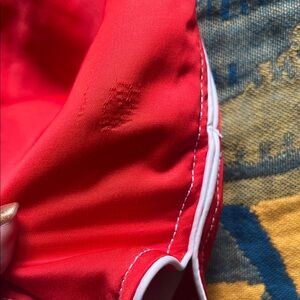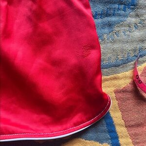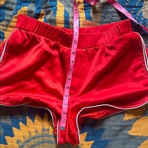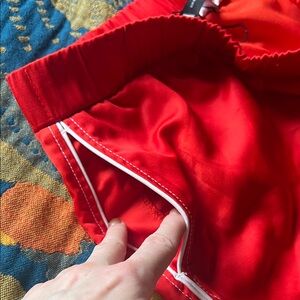 Retro red athletic style shorts with a sleek white piping accent. NWOT - never worn - please note there is a minor fabric flaw on the back right side which is not noticeable when worn. See pics for details and measurements.